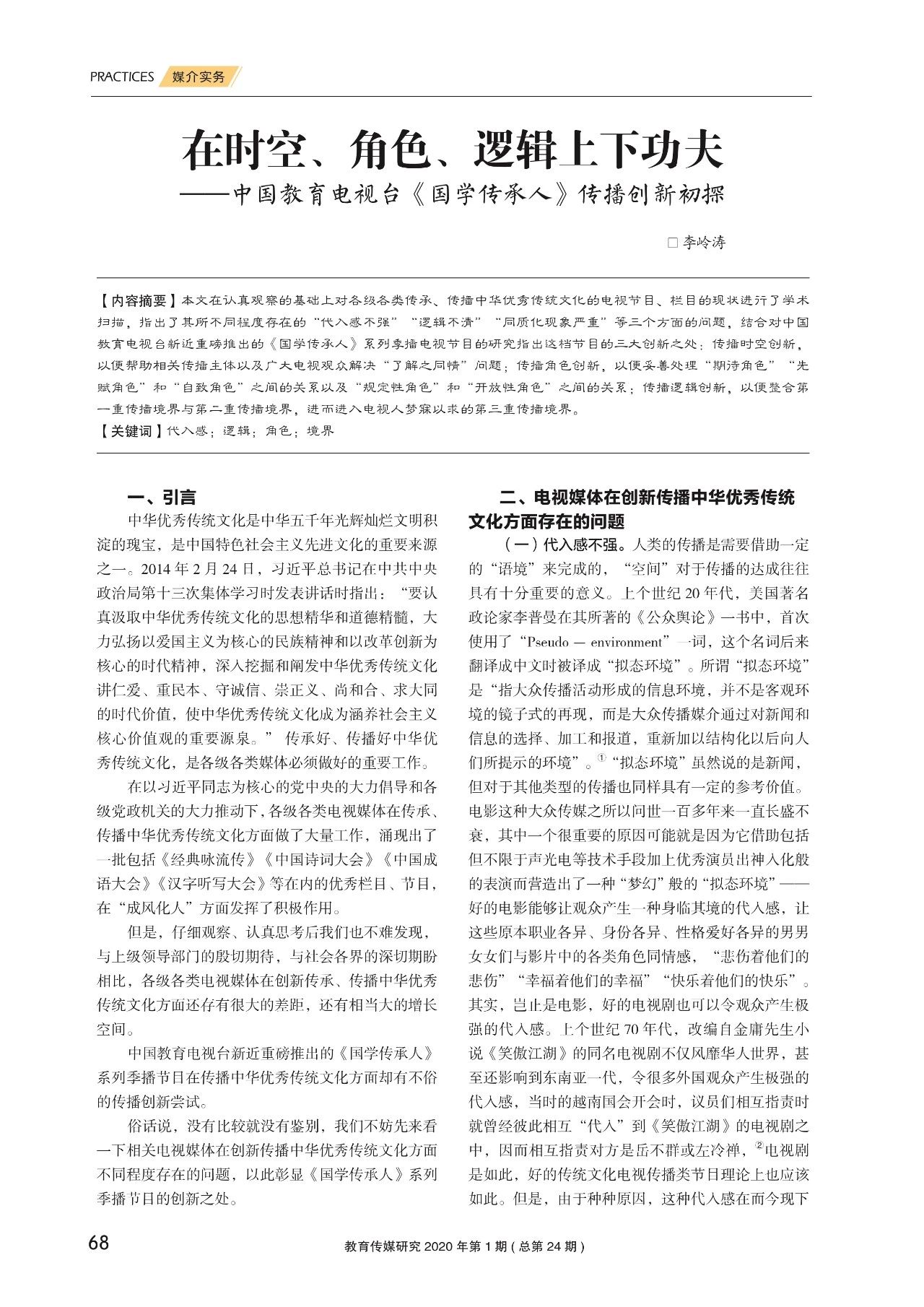 1月15日,由中华人民共和国教育部主管、中国教育电视台主办的《教育传媒研究》2020年第1期杂志刊发,在主要固定版块《媒介务实》中不吝言辞,盛赞中国教育电视台《国学传承人》节目。《教育传媒研究》杂志《在时空、...